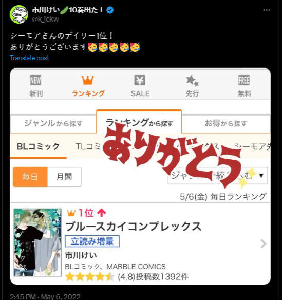 εΈε·ε η finding out about the volume reaching number 1 on the daily rankings on cmoa!π₯Ή This was actually surprising because the latest book has been out for some time - this meant that more readers purchased the book during a campaign period, leading to the work shooting up the daily rankings! Sensei was very happy, even the editor-san posted a congratulatory message π©·